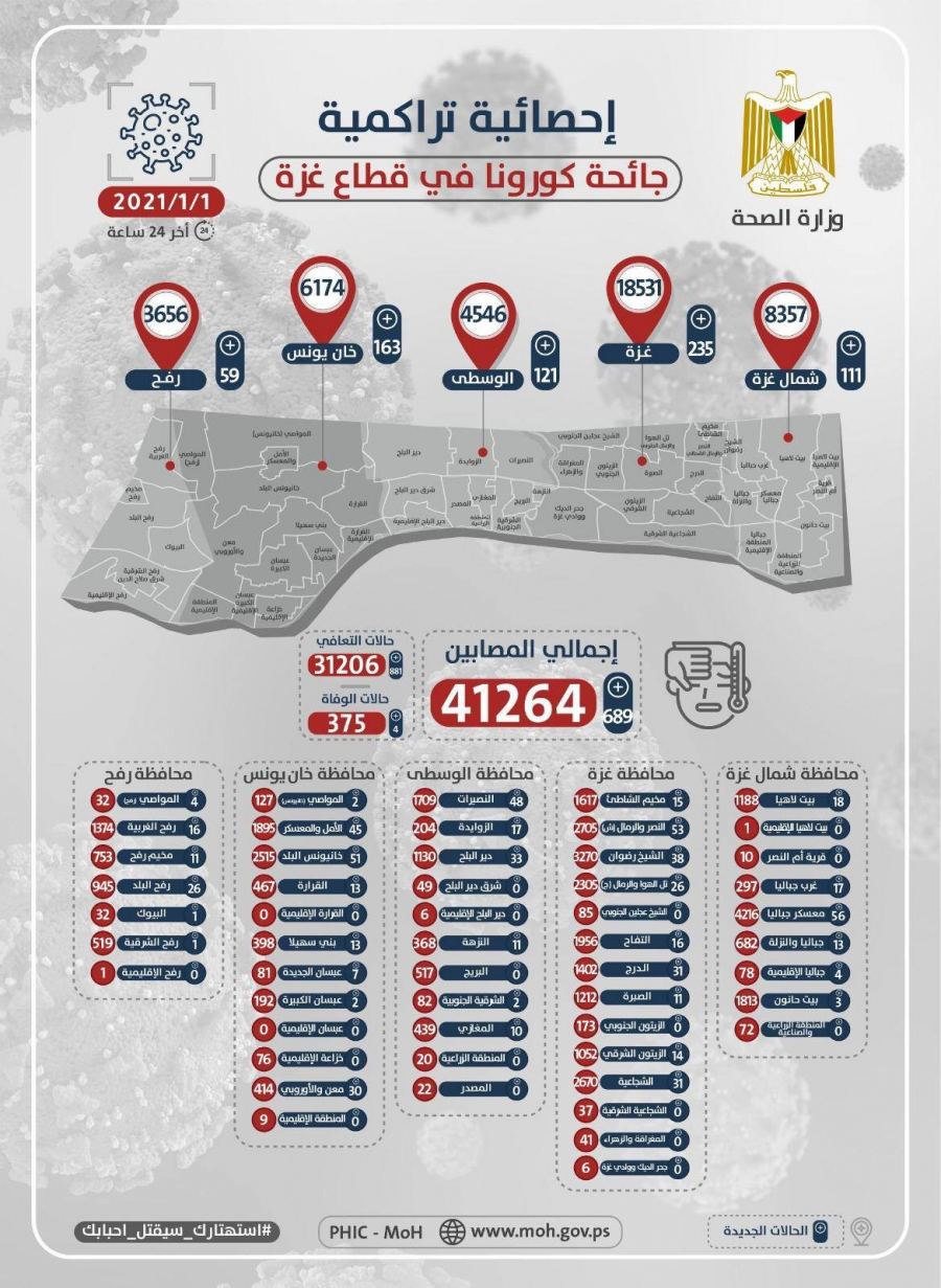 الصحة في غزة تنشر الخارطة الوبائية لفيروس كورونا في قطاع غزة الحياة برس - نشرت الصحة في قطاع غزة مساء الجمعة خريطة توضح الخارطة الوبائية في القطاع. calendar_month01/01/2021 04:45 pm مقالات ذات صلة share إطلاق النار على شاب عند مدخل سلفيت شمال الضفة الغربية بزعم محاولة تنفيذ عملية طعنshare أبو هولي يبحث مع السفير الهولندي سبل دعم الاونروا وحماية ولايتها من مخاطر الاستهداف الوجودي share "شؤون اللاجئين بالمنظمة" و "مركز أبحاث سياسات اللاجئين" يعقدان جلسة حواريةshare اللجنة العليا لمتابعة أحوال أبناء شعبنا في لبنان تعقد اجتماعا في رام اللهshare أبو هولي يبحث مع السفيرة الألمانية تحديات تمويل "الأونروا"share لجنة اللاجئين شؤون اللاجئين تبحثان سبل مواجهة مخططات تصفية الأنروا وحماية حق العودة