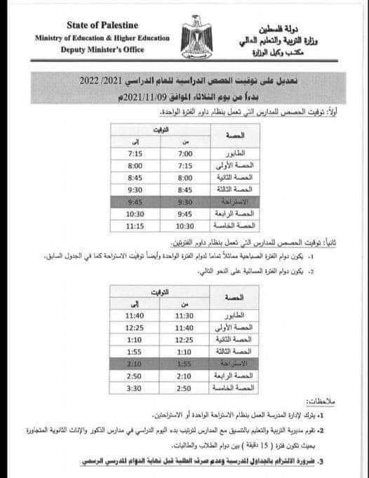 موعد دوام المدارس في قطاع غزة بعد تعديله الحياة برس - أعلنت وزارة التربية والتعليم في قطاع غزة مساء الاثنين، عن مواعيد جديدة لدوام الطلبة في المدارس الحكومية والتي جاءت على النحو التالي كما هو موضح بالصورة:.. calendar_month08/11/2021 11:37 pm مقالات ذات صلة share إطلاق النار على شاب عند مدخل سلفيت شمال الضفة الغربية بزعم محاولة تنفيذ عملية طعنshare أبو هولي يبحث مع السفير الهولندي سبل دعم الاونروا وحماية ولايتها من مخاطر الاستهداف الوجودي share "شؤون اللاجئين بالمنظمة" و "مركز أبحاث سياسات اللاجئين" يعقدان جلسة حواريةshare اللجنة العليا لمتابعة أحوال أبناء شعبنا في لبنان تعقد اجتماعا في رام اللهshare أبو هولي يبحث مع السفيرة الألمانية تحديات تمويل "الأونروا"share لجنة اللاجئين شؤون اللاجئين تبحثان سبل مواجهة مخططات تصفية الأنروا وحماية حق العودة