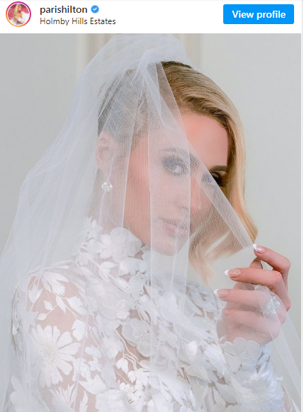 ونشرت باريس هيلتون صورتها الأولى من حفل الزفاف وهي ترتدي الفستان الأبيض، على حسابها في انستغرام وكتبت معلقة "اللانهاية تبدأ اليوم - My forever begins today".