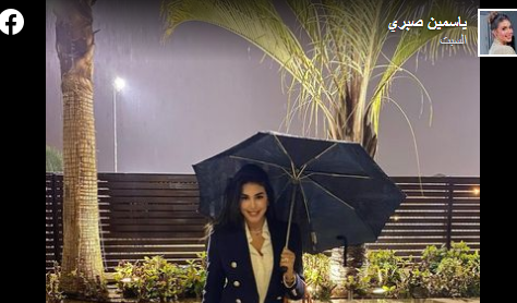 وظهرت ياسمين صبري ترتدي بنطلون جينز وبليزر كحلية اللون، وتحمل مظلة، معلقة قائلة "الجو ده عايز إيه".