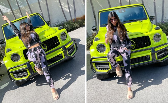 وظهرت مايا خليفة أمام سيارة جيب مرسيدس حديثة، بألوان جاءت ما بين الأخضر والفسفوري، وعلق الجمهور على اختيارها الغريب لهذا اللون.