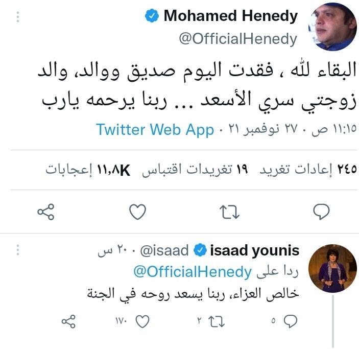 وكتب هنيدي قائلا "البقاء لله ، فقدت اليوم صديق ووالد، والد زوجتي سري الأسعد ... ربنا يرحمه يارب".