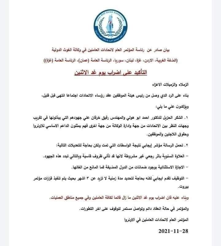 بناءاً عليه فان اضراب غد الاثنين ما زال قائما لكافة العاملين في جميع مناطق العمليات