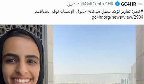 مركز الخليج لحقوق الإنسان أكد مقتل نوف المعاضيد بعد عودتها من بريطانيا، ولكن لم يصدر أي تعقيب من السلطات القطرية عن هذا الأمر.