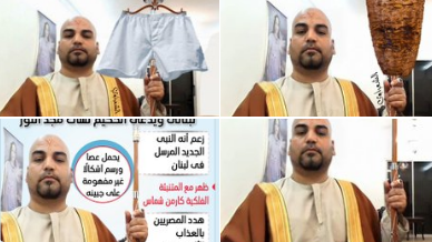 وأعلنت الفتاة التي تقف بجواره عن رسالته الدينية الجديدة زاعمة بأنها رسالة سماوية لأول نبي في لبنان، ليخرج أهل لبنان من مصائبهم ومشاكلهم.