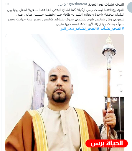 وفي آخر صيحات النبي نشأت المزعوم كتب حساب يحمل إسمه على تويتر "للتوضيح:العصا ليست راس اركيلة كما اشاع البعض انها عصا سحرية اتنقل بيها بين البلدان بدقيقة واحدة والخاتم انشر به طاقة حب اوغضب حسب رضايي على شعوبي وكل شخص يقوم بشتمي سوف يشاهد كوابيس ويصير معه حوادث ومصر سوف يحدث بها زلزال قريبا لانه اتمسخروا عليي".