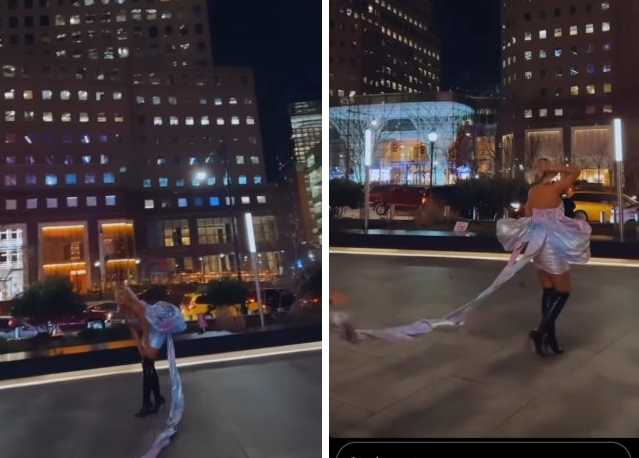 حيث ظهرت مودل روز في طريق عام ترتدي فستان قصير لونه زهري.