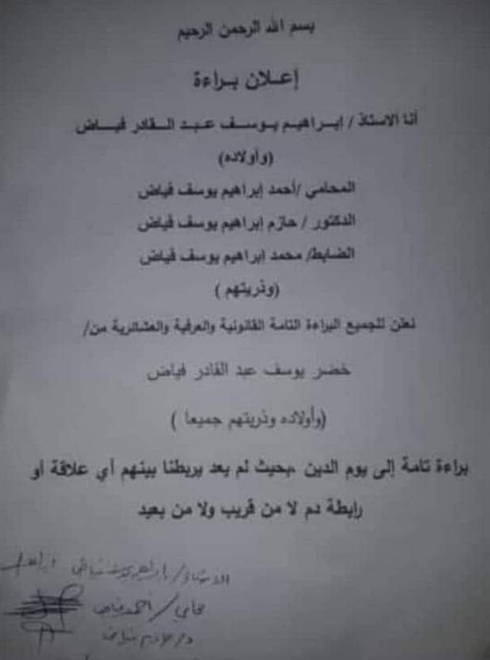 وأكد فياض بأنه يتبرأ من شقيقه وأبنائه براءة تامة قانونياً وعرفياً وعشائرياً.