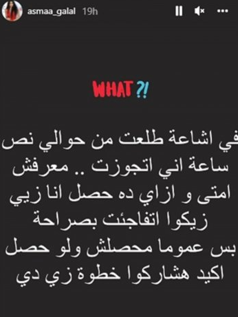 وكتبت أسماء جلال قائلة "في إشاعة طلعت إني أتجوزت، معرفش أمتى وإزاي ده حصل أنا زيي زيكوا اتفاجئت بصراحة، بس عموما محصلش لو حصل أكيد هشاركوا خطوة زي دي".