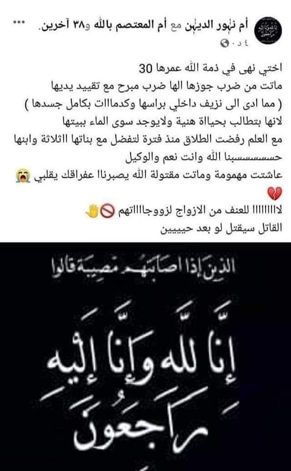 في التفاصيل كشفت سيدة قالت بأنها شقيقة الزوجة، ان شقيقتها تعرضت للضرب المبرح على يد زوجها بعد تقييد يديها مما تسبب بنزيف داخلي برأسها وكدمات في جسدهاات لوفاتها.