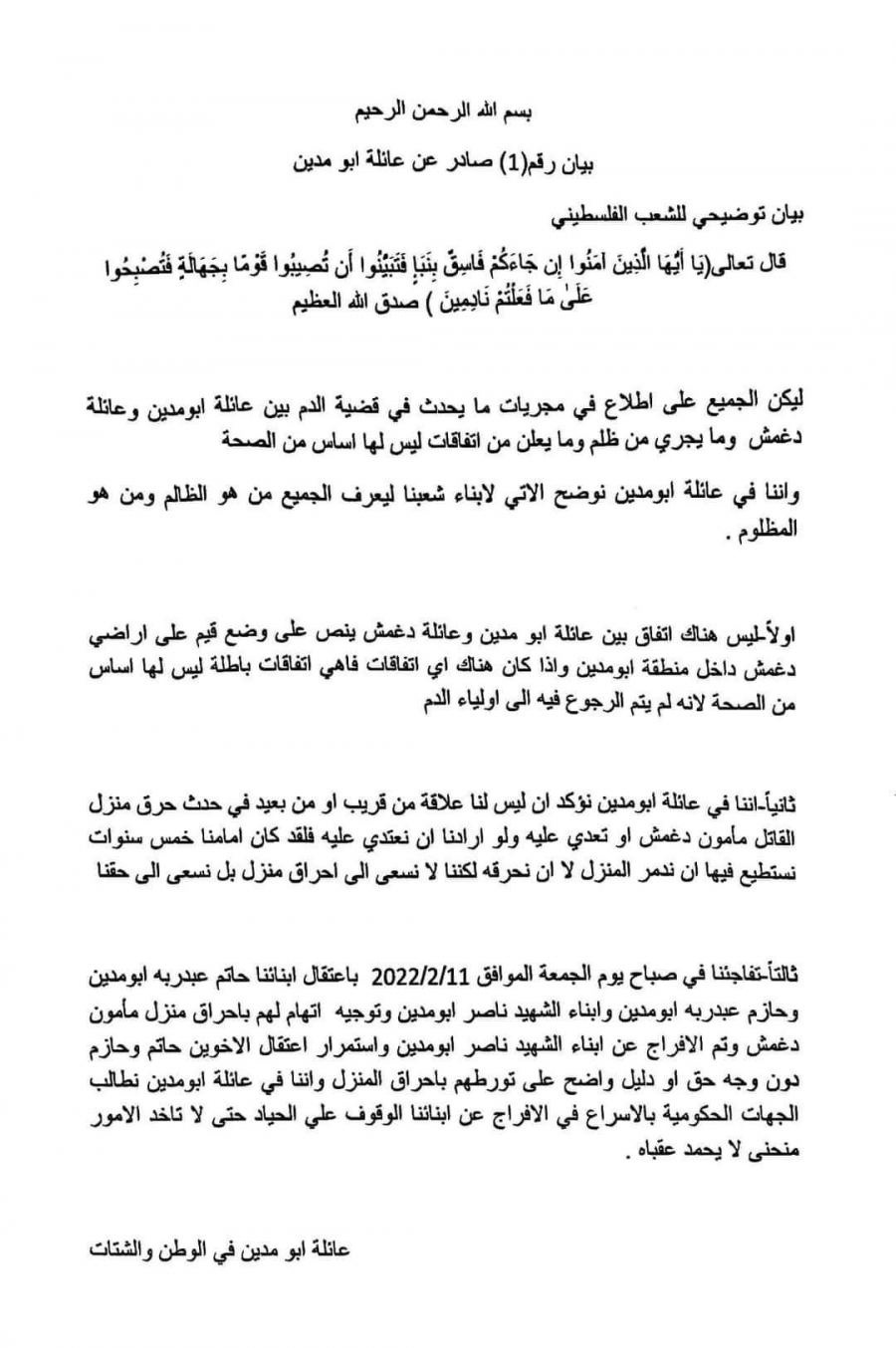 الحياة برس - أصدرت عائلة ابو مدين في قطاع غزة الجمعة، بيانا حول الخلاف مع عائلة دغمش وحادثة احراق منزل يعود لعائلة دغمش موجود في منطقة ابو مدين غرب مدينة الزهراء جنوب مدينة غزة.