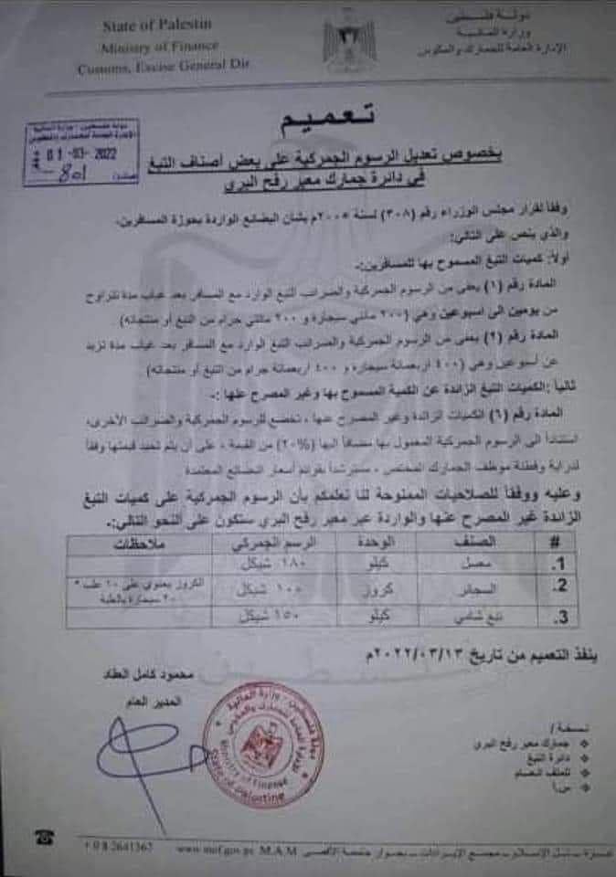 الحياة برس - تداول نشطاء وصفحات اخبارية عبر مواقع التواصل الاجتماعي في قطاع غزة، صورة لقرار جديد صادر وزارة المالية "دائرة الجمارك والمكوس" في غزة، يفيد بزيادة الضريبة على اصناف التبغ والمعسل التي يدخلها المسافرون معهم خلال عودتهم للقطاع عبر معبر رفح البري.