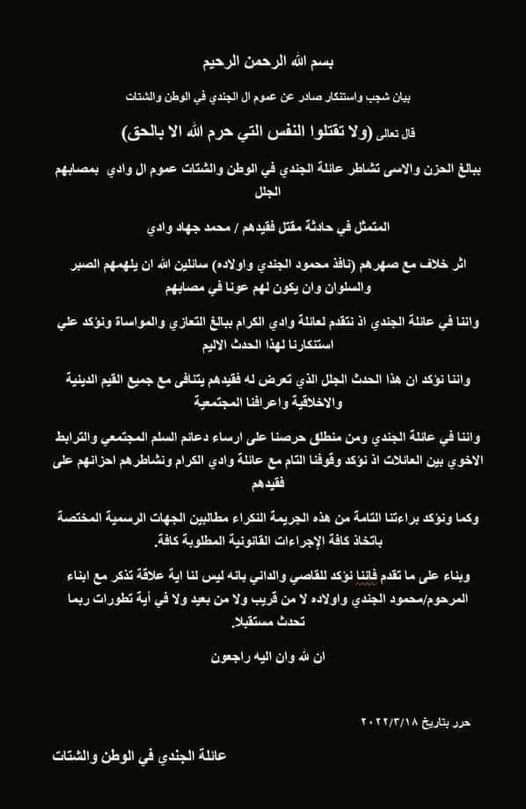 وقالت العائلة في بيان لها الجمعة، أنها تشاطر عائلة الجندي حزنها بفقيدها، معلنة برائتها من المتهم بالجريمة نافذ محمود الجندي وأبنائه وهو صهر عائلة وادي، بالاضافة لبرائتها من أبناء المرحوم محمود الجندي وأبنائه.