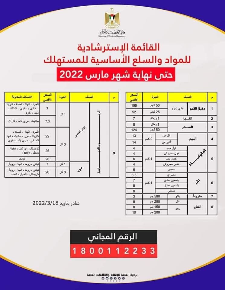 قائمة الأسعار من وزارة الاقتصاد للبضائع في غزة الحياة برس - نشرت وزارة الاقتصاد في غزة الجمعة، قائمة استرشادية جديدة للمواد التموينية الأساسية للمستهلك حتى نهاية شهر مارس/2022. المصدر: الحياة برس calendar_month19/03/2022 08:38 am