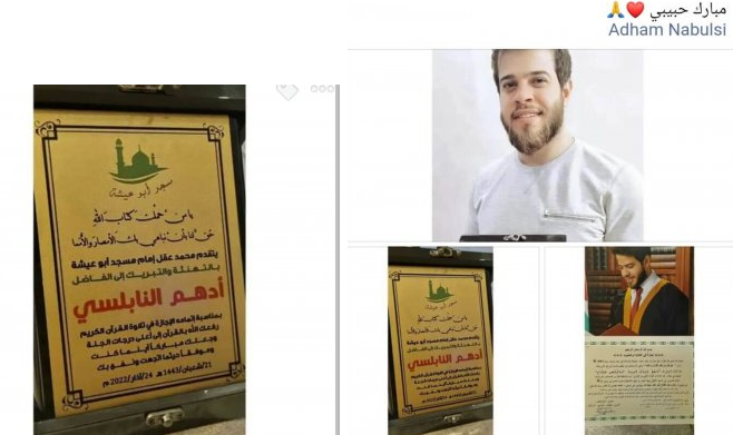 وكتب على الدرع "يتقدم محمد عقل إمام مسجد أبو عيشة بالتهنئة والتبريك إلى الفاضل أدهم النابلسي بمناسبة إتمامه الإجازة في تلاوة القرآن الكريم".