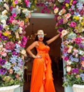 حيث ظهرت مرتدية فستان برتقالي، بالإضافة لقبعة ونظارات شمسية مع مكياج خفيف.