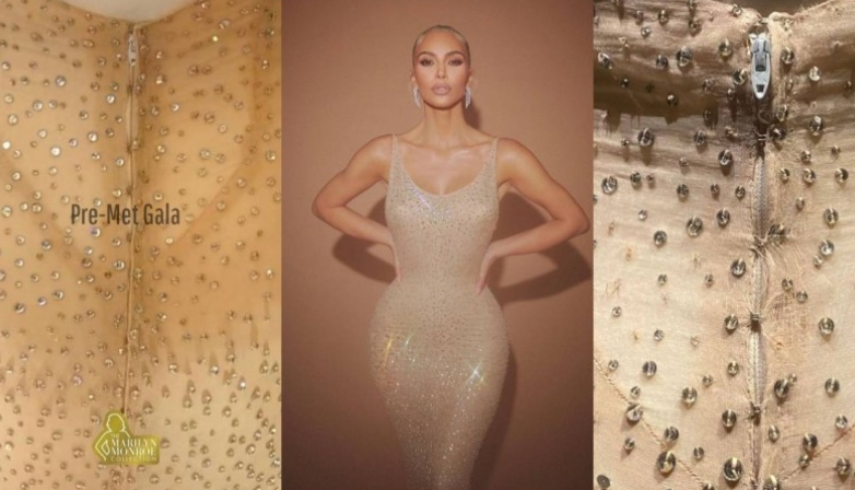 وزعم أحد المراقبين بأن الفستان تعرض للضرر بعد إرتدائه من كيم كارداشيان، وأنه فقد بعض الكريستالات الثمينة، وبدا البعض الآخر معرض للسقوط وكأنه معلق بخيط حسب وصف الحساب.