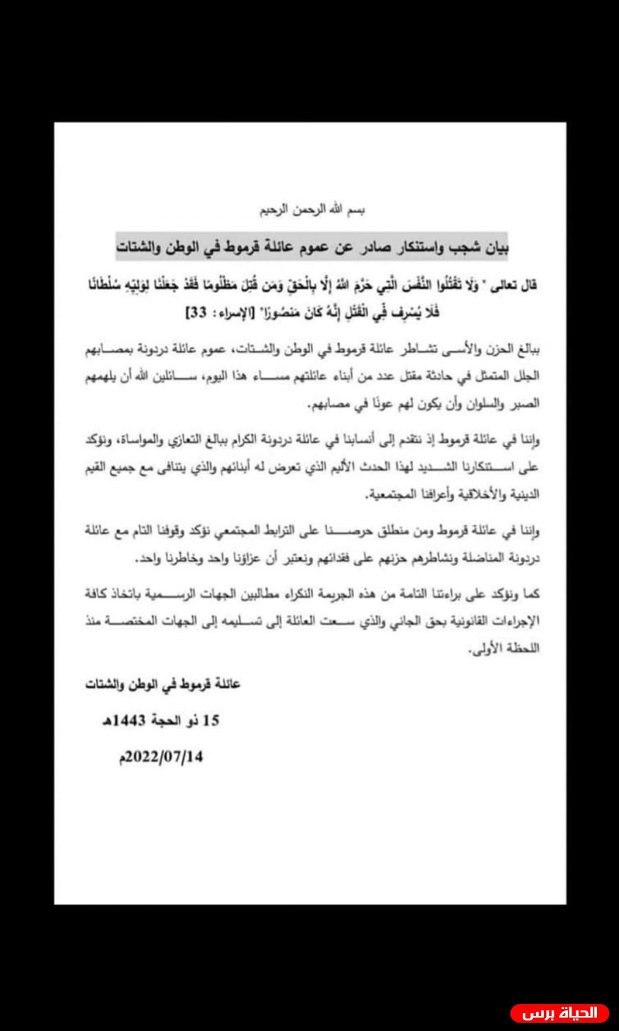 بيان عائلة قرموط حول مقتل المواطن عبد العزيز دردونة والطفلة ياسمين الحياة برس -بيان عائلة قرموط حول مقتل المواطن عبد العزيز دردونة والطفلة ياسمين دردونة. المصدر: الحياة برس calendar_month15/07/2022 12:33 am مقالات ذات صلة share إطلاق النار على شاب عند مدخل سلفيت شمال الضفة الغربية بزعم محاولة تنفيذ عملية طعنshare أبو هولي يبحث مع السفير الهولندي سبل دعم الاونروا وحماية ولايتها من مخاطر الاستهداف الوجودي share "شؤون اللاجئين بالمنظمة" و "مركز أبحاث سياسات اللاجئين" يعقدان جلسة حواريةshare اللجنة العليا لمتابعة أحوال أبناء شعبنا في لبنان تعقد اجتماعا في رام اللهshare أبو هولي يبحث مع السفيرة الألمانية تحديات تمويل "الأونروا"share لجنة اللاجئين شؤون اللاجئين تبحثان سبل مواجهة مخططات تصفية الأنروا وحماية حق العودة