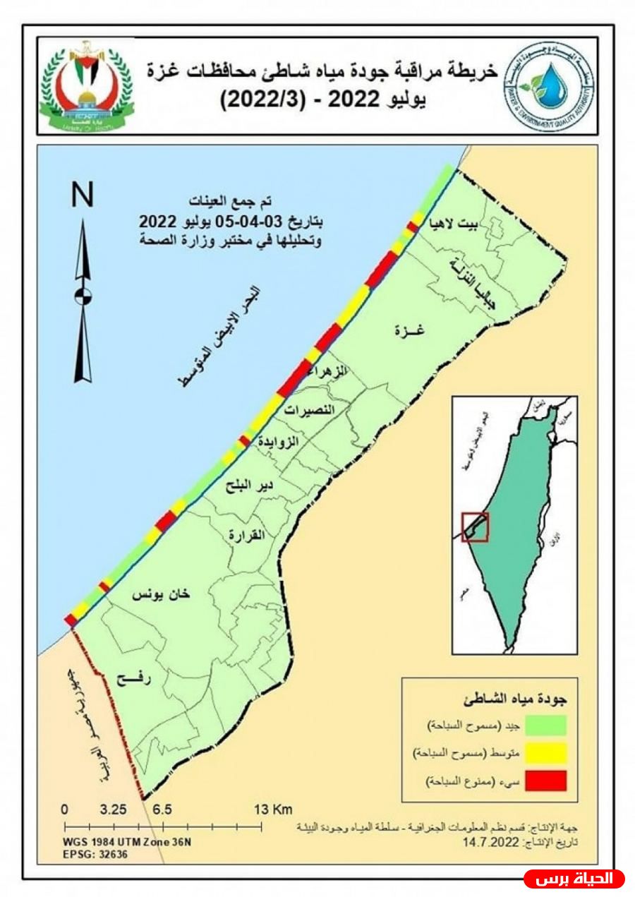 وأوضحت سلطة المياه أن 70% من شواطئ محافظات قطاع غزة آمنة للسباحة بحسب خريطة توضح تقييم جودة شاطئ محافظة غزة المبنية على الفحص الميكروبيولوجي والتفتيش الصحي للشاطئ لدورة يوليو 2022.