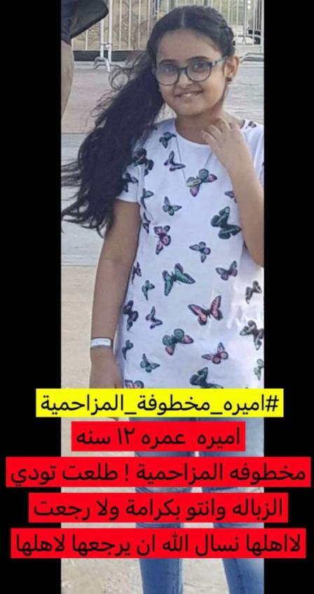 وقال مغردون على موقع تويتر، أن الطفلة خرجت منذ أمس من منزل ذويها في منطقة المزاحمية غرب مدينة الرياض لتلقي القمامة، ولكنها لم تعد، مشيرين لإختطافها.