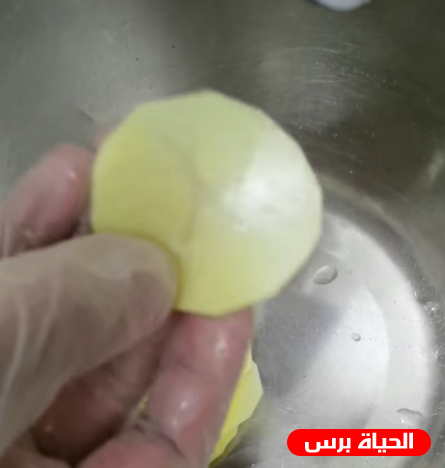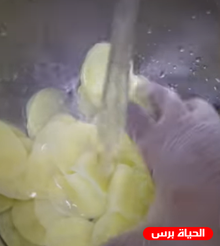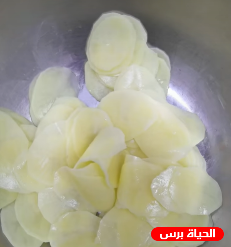 - نقوم بتقطيع البطاطس دوائر من خلال مبشرة أو بالسكين وتكون رقيقة