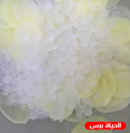 - نضع على البطاطس الثلج والماء والملح والسكر "الماء حتى يغطيها قليلاً، والملح ملعقة والسكر ملعقة والثلج المكسر قليلاً".