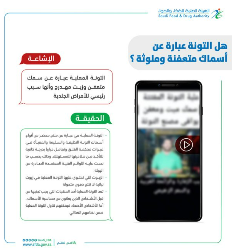 وحول الزيوت المضرة والمهدرجة أوضحت الهيئة أن التونة المعلبة طبيعية ولا ينتج عنها دهون متحولة، وأن الحالة الوحيدة التي تسبب فيها التونة أضرار صحية هي للأشخاص المصابين بالحساسية من الأسماك.