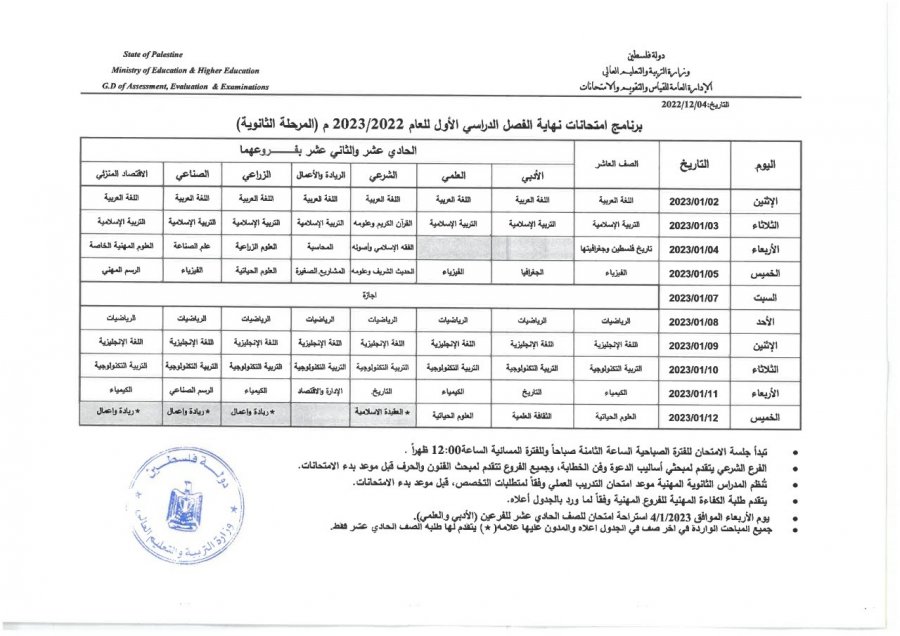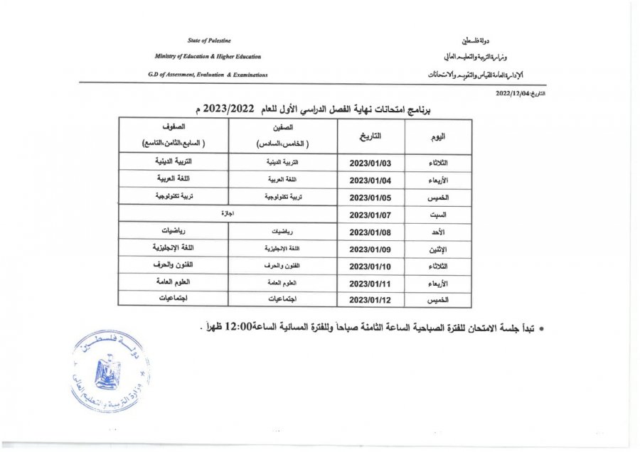 وأوضحت الوزارة أن امتحانات المرحلة الثانوية تبدأ بتاريخ 2/1/2023، وامتحانات الصفوف من الخامس حتى التاسع تبدأ بتاريخ 3/1/2023 ، وتنتهي الفترة الدراسية الثانية بتاريخ 12/1/2023.