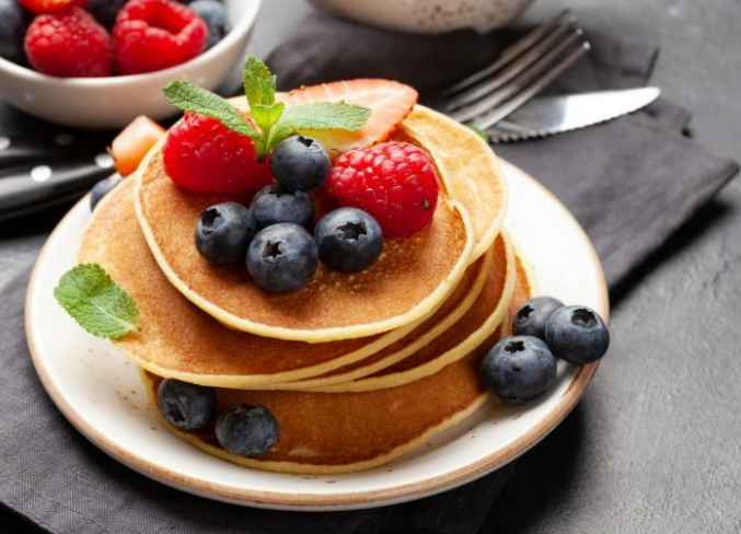 - سخن مقلاة على نار متوسطة واسكب كمية صغيرة من العجين في المقلاة. تُقلى البان كيك حتى يظهر الجزء العلوي بعض الفقاعات وتتحول إلى اللون الذهبي. ثم قلب البان كيك على الجانب الآخر وقلبه مرة أخرى حتى يصبح جاهزًا.