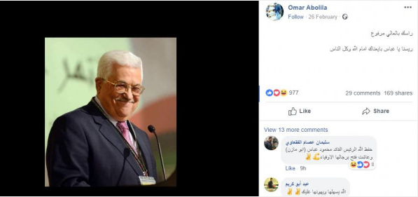 والمنشور الوحيد الذي قد يعتبره البعض سياسي هو مبايعته للرئيس الفلسطيني محمود عباس حيث كتب على صفحته :" راسك في العالي مرفوع #بايعناك ريسنا يا عباس أمام الله وكل الناس ".