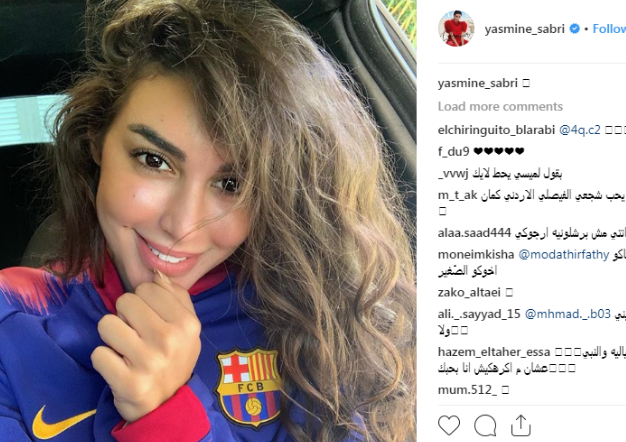 ونشرت ياسمين صبري صورة لها عبر حسابها على انستغرام وهي ترتدي قميص النادي الاسباني.