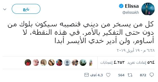وقالت أليسا على حسابها في تويتر أن كل من يسخر من دينها فسوف تحظره بدون مساومة.