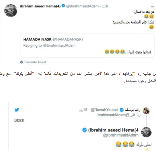 ونشر ابراهيم عدة تغريدات عبر من خلالها عن صدمته من حظر رانيا له، ونشر فيديو وعلق عليه " هيما مصدوم ".