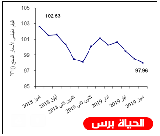 الحياة برس - سجل الرقم القياسي العام لأسعار المنتج انخفاضاً مقداره 0.59% خلال شهر تموز 2019 مقارنة مع شهر حزيران 2019، حيث بلغ الرقم القياسي العام 97.96 خلال شهر تموز 2019 مقارنة ﺒ 98.54 خلال شهر حزيران 2019 (سنة الأساس 2018 = 100).