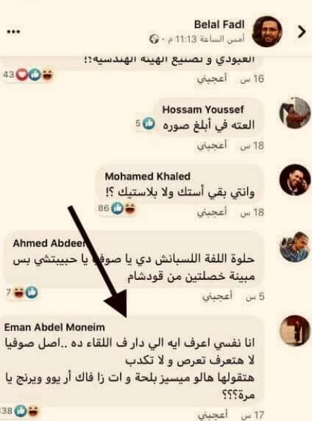 وذكر بلاغ صبري أن إيمان ردت على تغريدة بلال فضل بكل إسفاف وتدني بتغريدة أخرى، وتهين فيها سيدة مصر، حسب قول المحامي.