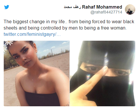 وقالت رهف القنون على حسابها في تويتر:"أكبر تغيير في حياتي هو التحول من إجباري على ارتداء الشراشف السوداء وسيطرة الرجال علي، لأصبح امرأة حرة".