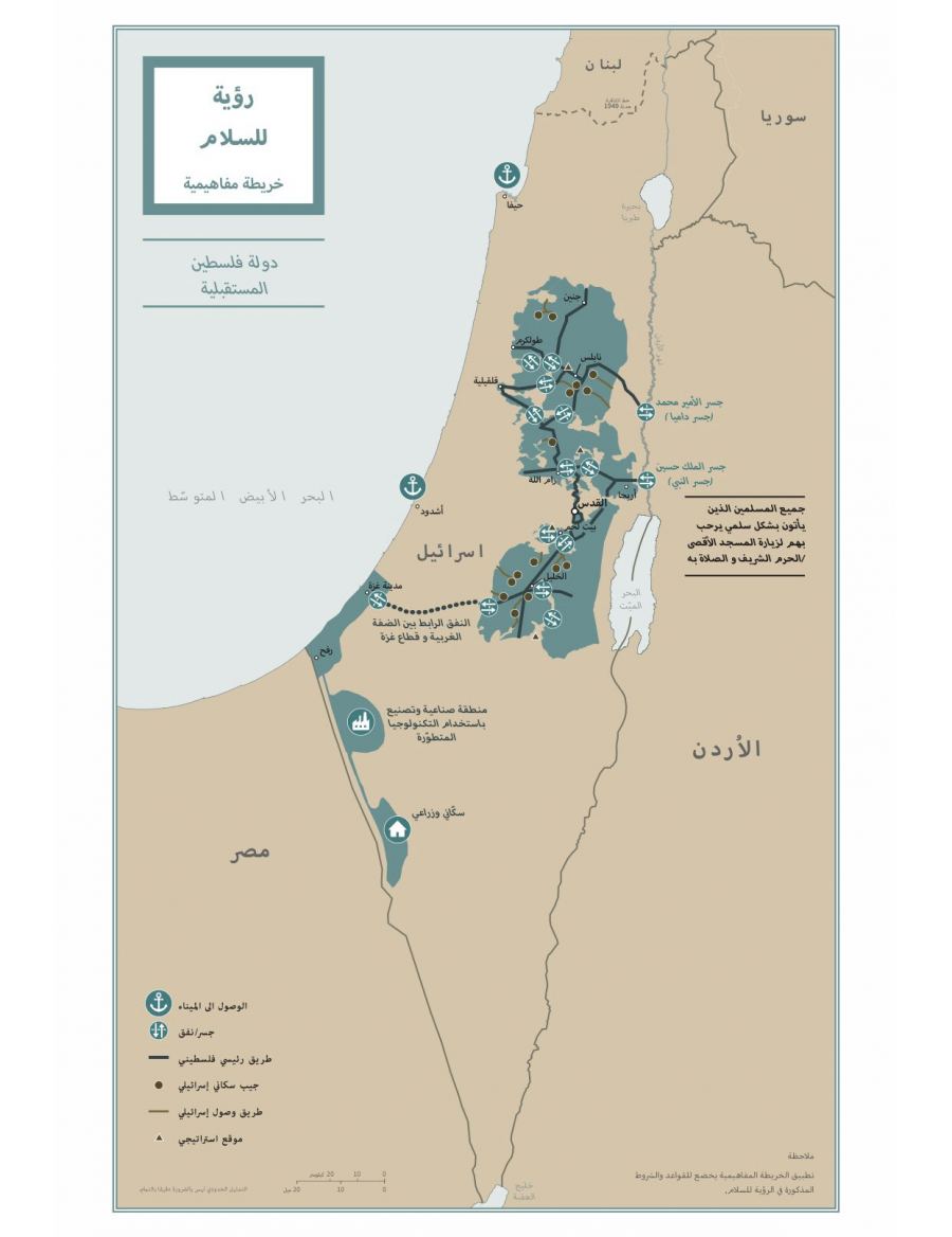 وبين ترامب أن الدولة الفلسطينية حسب رؤيته ستضم قطاع غزة ومناطق من الضفة الغربية وبعض أحياء القدس ومناطق من النقب والمناطق الحدودية مع مصر.