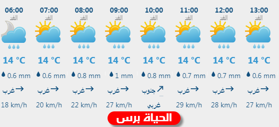 توضيح لحالة الطقس من الساعة السادسة صباحاً حتى الواحدة ظهراً وكمية الأمطار المتوقع هطولها