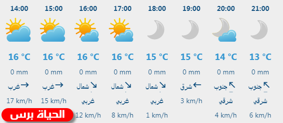 هذه الليلة : يكون الجو غائماً جزئياُ وبارداً الى شديد البرودة ، وتكون فرصة ضعيفة لسقوط امطار خفيفة متفرقة فوق بعض المناطق ،الرياح شمالية غربية الى غربية خفيفة الى معتدلة السرعة والبحر خفيف ارتفاع الموج.