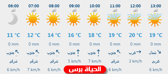 هذه الليلة : يكون الجو غائماً جزئيا وباردا نسباً الى بارد، والرياح جنوبية شرقية خفيفة السرعة والبحر خفيف ارتفاع الموج .
