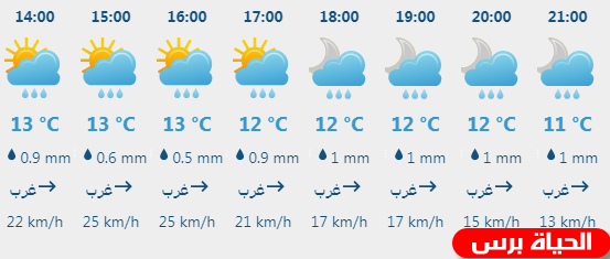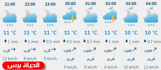 هذه الليلة : يكون الجو غائماً وشديد البرودة وتسقط بإذن الله الأمطار على معظم المناطق تكون غزيرة ومصحوبة بعواصف رعدية وزخات من البرد أحيانا وتكون الفرصة مهيأة لسقوط زخات ثلجية خفيفة فوق المرتفعات الجبلية التي ارتفاعها حوالي 1000متر فوق مستوى سطح البحر، والرياح جنوبية غربية إلى شمالية غربية معتدلة إلى نشطة السرعة مع هبات قوية احيانا والبحر مائجا .