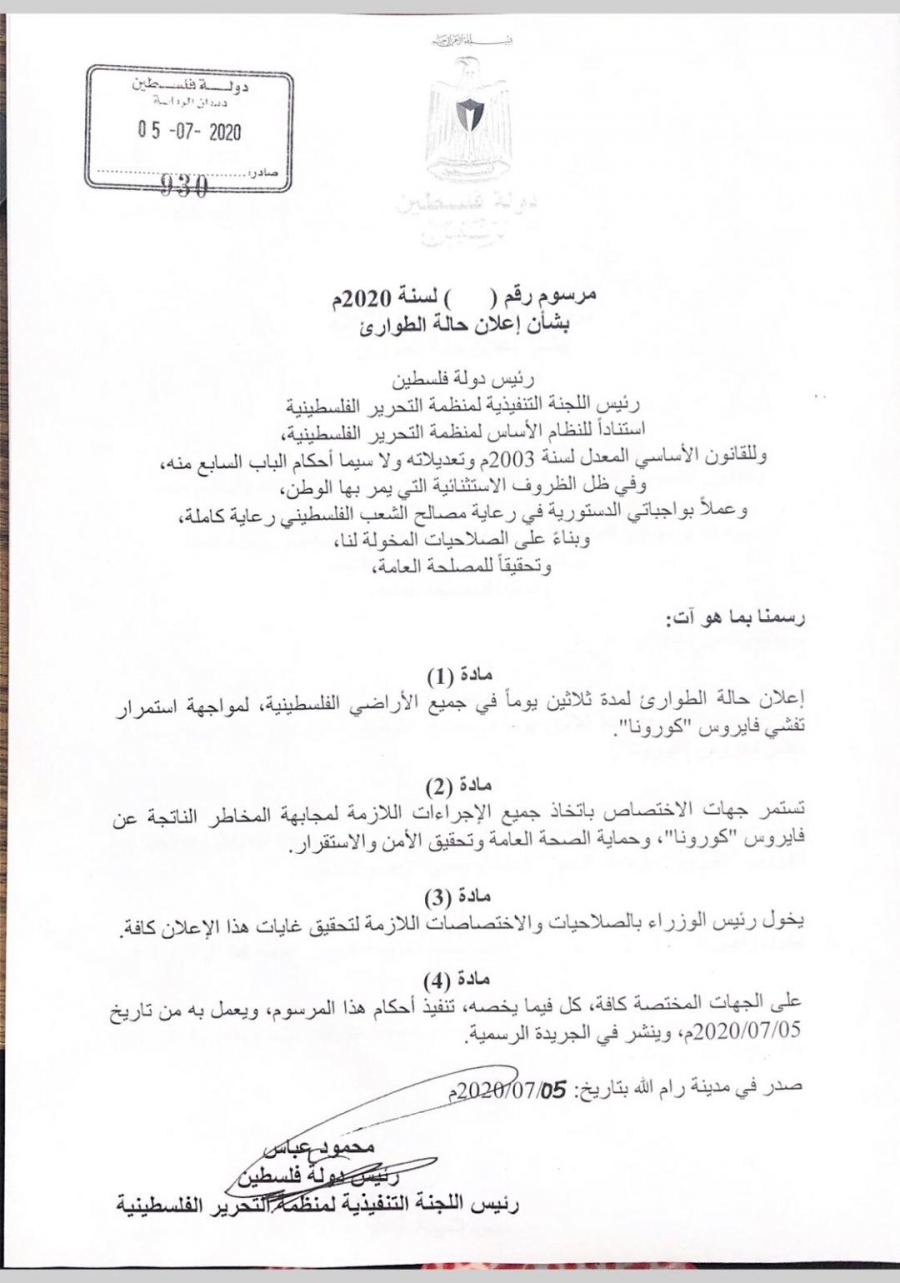 الرئيس عباس يمدد حالة الطوارئ 30 يوما الحياة برس - أصدر الرئيس الفلسطيني محمود عباس الأحد، مرسوما بتمديد حالة الطوارئ في البلاد 30 يوما لمواجهة تفشي فيروس كورونا. calendar_month05/07/2020 11:18 am مقالات ذات صلة share إطلاق النار على شاب عند مدخل سلفيت شمال الضفة الغربية بزعم محاولة تنفيذ عملية طعنshare أبو هولي يبحث مع السفير الهولندي سبل دعم الاونروا وحماية ولايتها من مخاطر الاستهداف الوجودي share "شؤون اللاجئين بالمنظمة" و "مركز أبحاث سياسات اللاجئين" يعقدان جلسة حواريةshare اللجنة العليا لمتابعة أحوال أبناء شعبنا في لبنان تعقد اجتماعا في رام اللهshare أبو هولي يبحث مع السفيرة الألمانية تحديات تمويل "الأونروا"share لجنة اللاجئين شؤون اللاجئين تبحثان سبل مواجهة مخططات تصفية الأنروا وحماية حق العودة