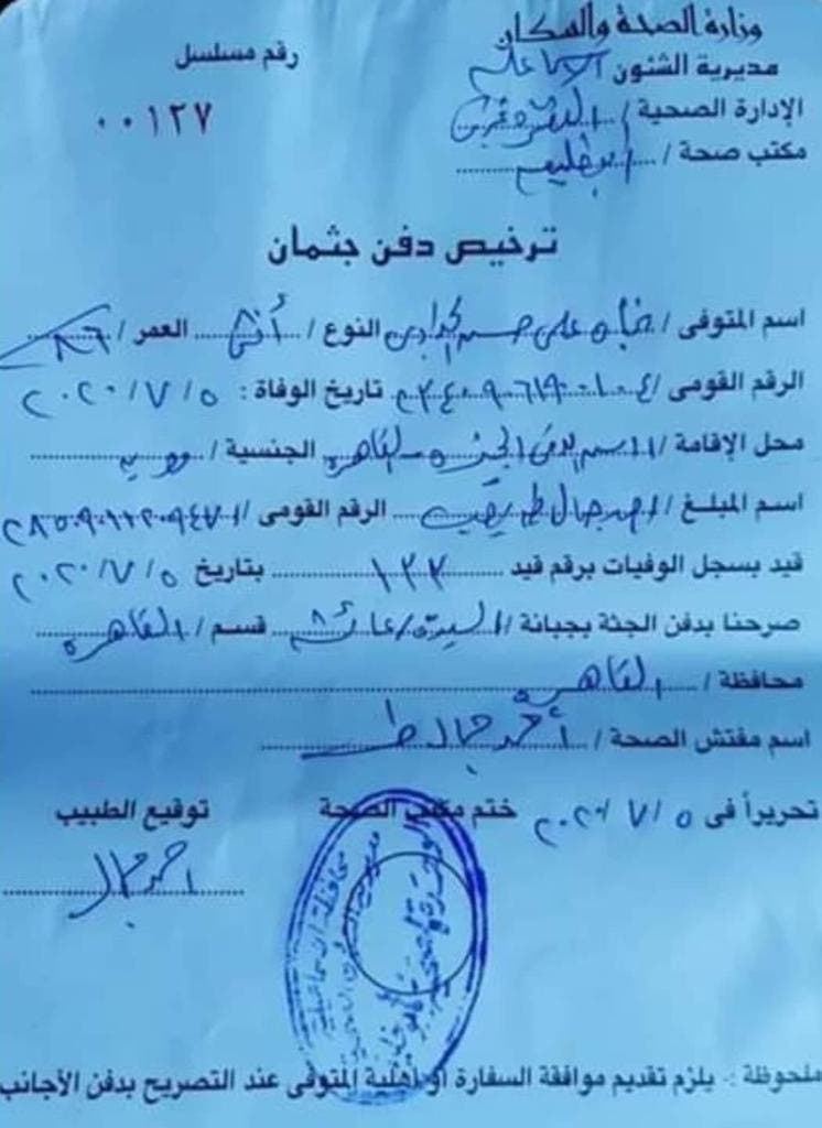 مؤكداً على دفن الجثمان في مقابر العائلة في منطقة السيدة عائشة في القاهرة.