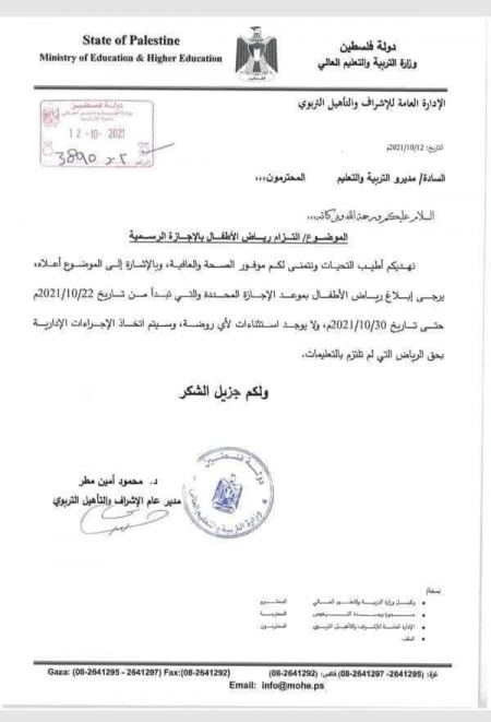 غزة السبت، أن إجازة التعليم في المدارس المقرر في 22/10/2021،...