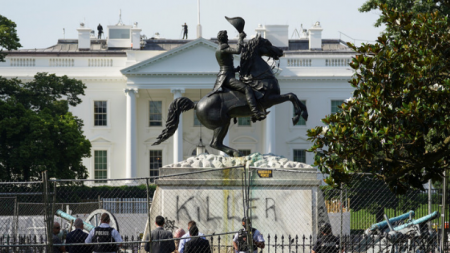 ترامب المحتجين الذين حاولوا إزالة تمثال الرئيس الأمريكي... ترامب على حسابه في تويتر:"تم القبض على عدد من الأشخاص في...