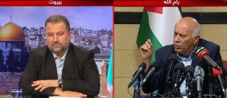 حماس " صالح العاروري، عبر الفيديو كونفرنس، من مقر هيئة الاذاعة... حماس وفتح لما تشكلانه من ثقل أن تكونا المبادِرَتين، العنصر...